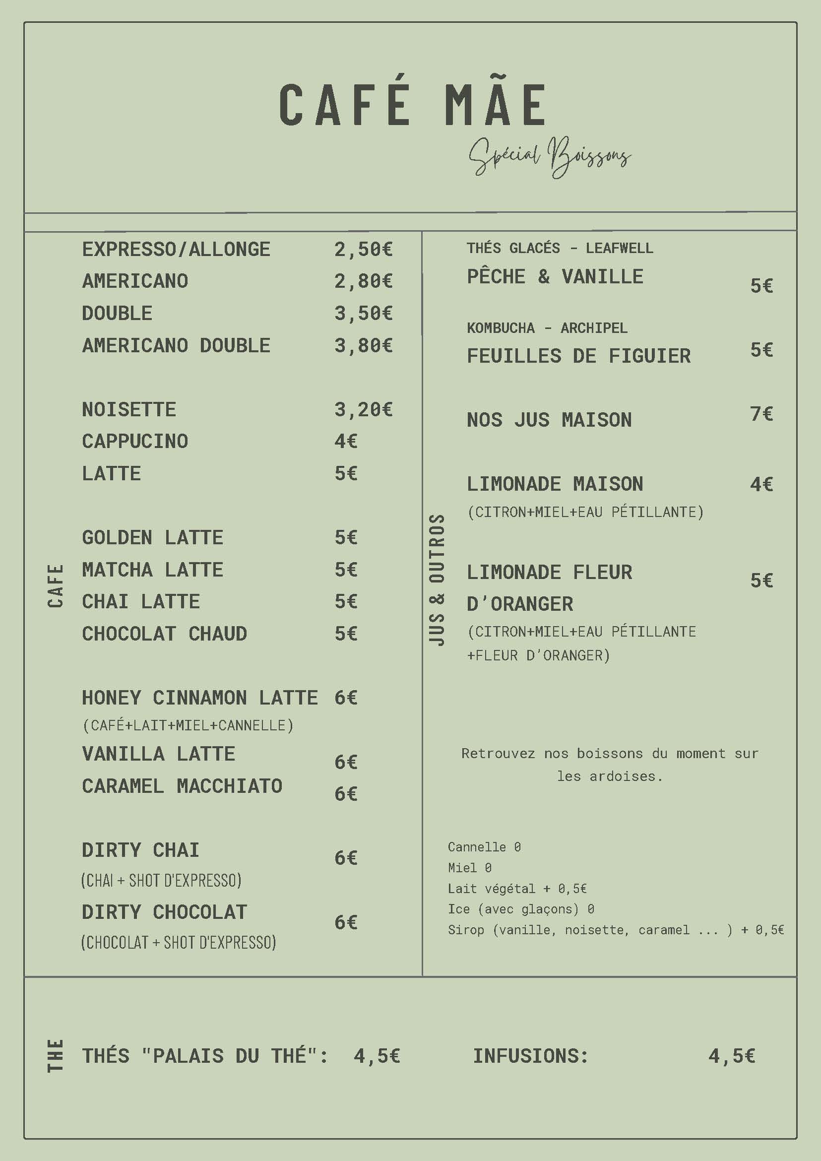 Une parenthèse gourmande et réconfortante, où chaque boisson, chaque plat et chaque dessert est préparé maison. Des recettes saines, équilibrées et pensées pour offrir autant de douceur que de saveurs. Une carte qui invite à prendre son temps, à savourer, et à profiter simplement du moment.